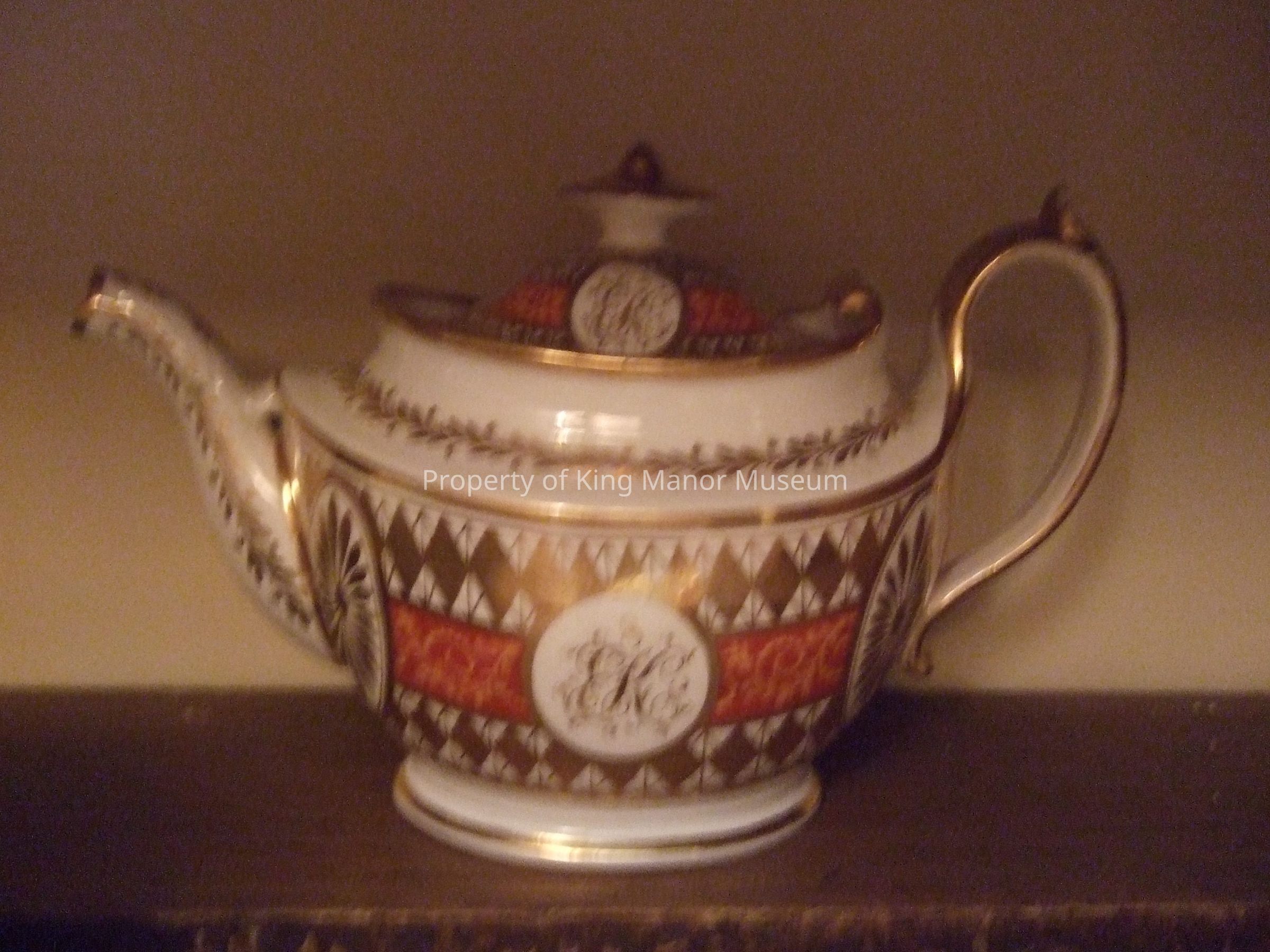 Porcelain teapot, part of incomplete service, with neoclassical style decoration. Iron red band in center of body and lid decorated with gilded leaf motif, white and gilded diamond pattern ground. Edges trimmed with gilding and spout decorated with gilded leaf/foliage pattern. Central medallions on body and lid have gilded monograms of "EK".