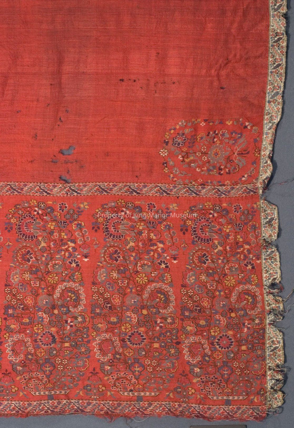 Eliza Gracie King's Kashmir shawl, rectangular in shape. Finely woven, bright red twill ground with wide borders on ends decorated with floral embroidery. Narrow tape borders were sewn all around the edges of the shawl. Seperate floral embroidery at the corners, above the borders.Collection