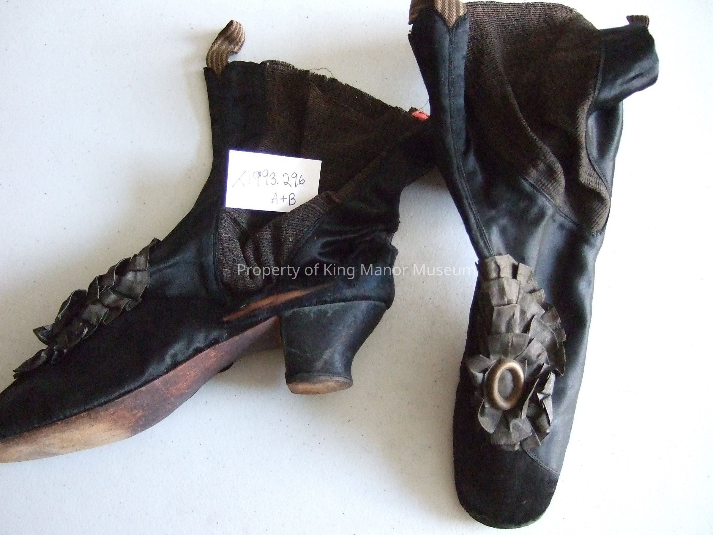 Pair brown leather woman's heeled boots having elasticized gussets and brown cloth ruffled decoration