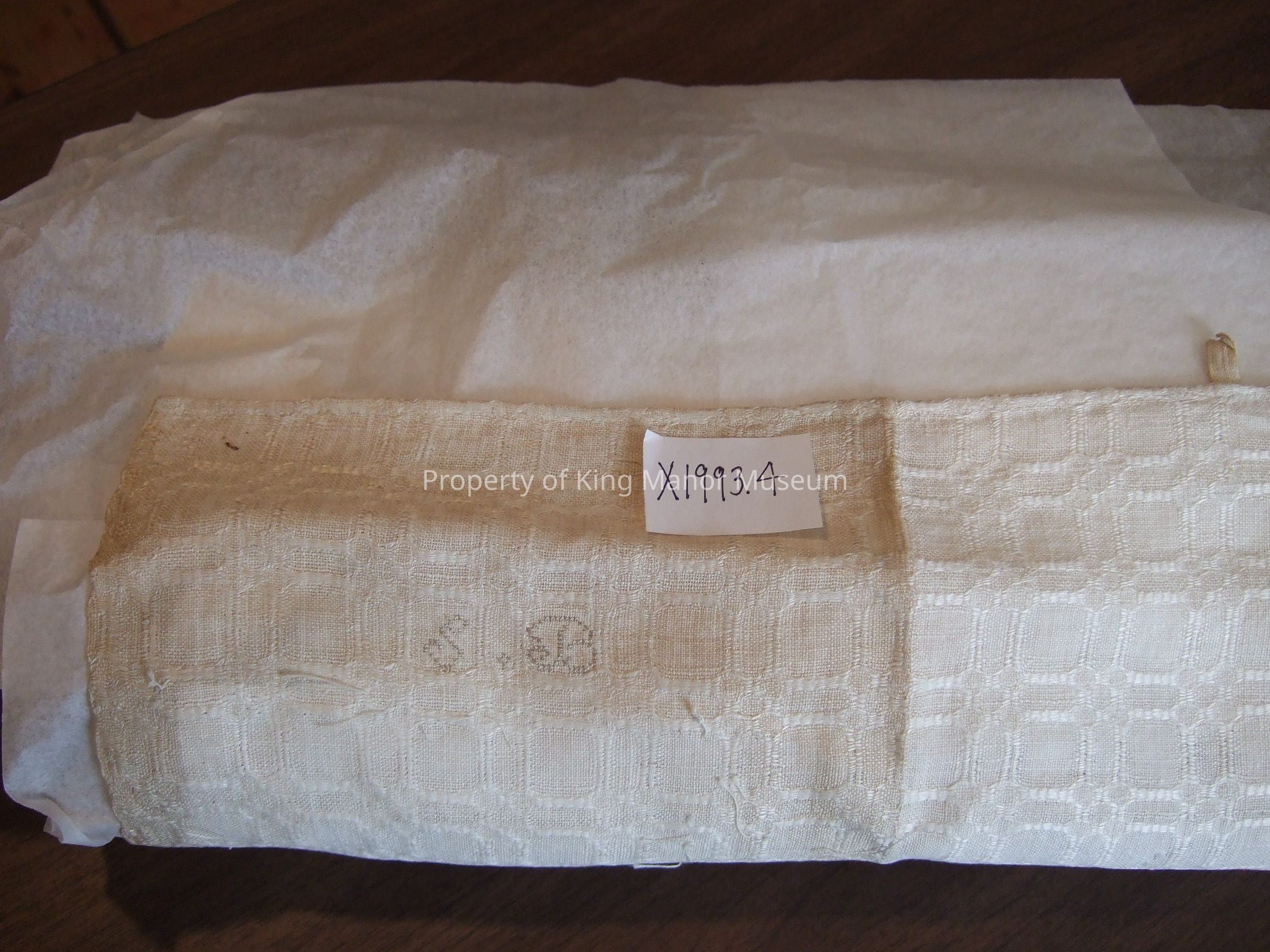 Hand woven patterned weave, linen hand towel with initials "S.B." in cross stitch. Label originally sewn on , "Flax spun - and towel woven/ by Sarah Spring/ Between 1790-1800/ Loaned by her Great-Granddaughter/ Kate Porter Blanchard/ Jamaica, D.A. R./ Elizabeth Annes by Lewis Chapter."Collection
