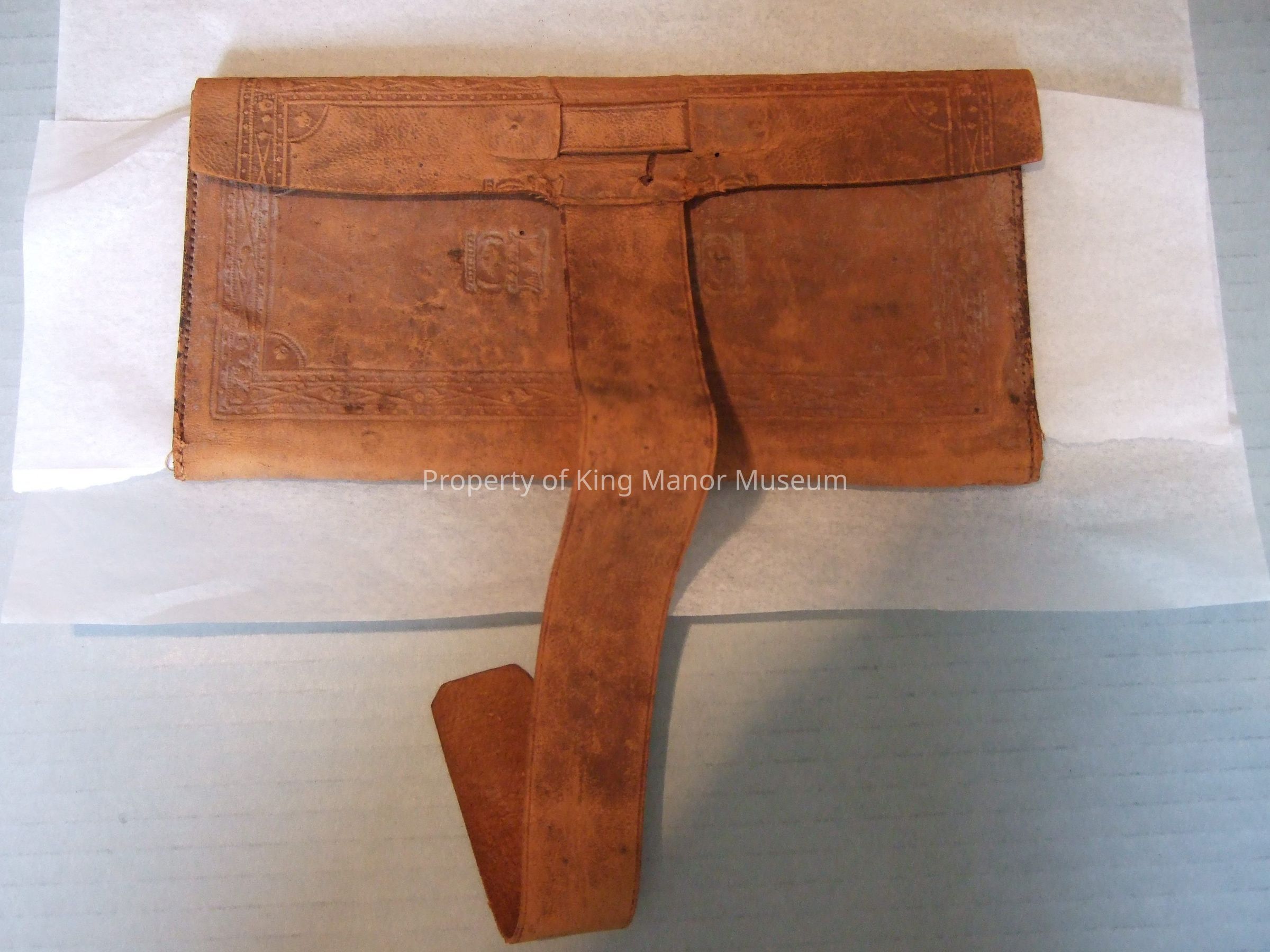 Tooled leather russet-collred wallet having wraparound strap and self buckle