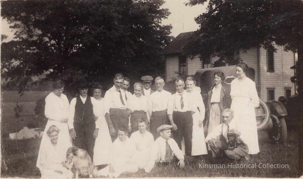 Group of people standing in front house.Collection