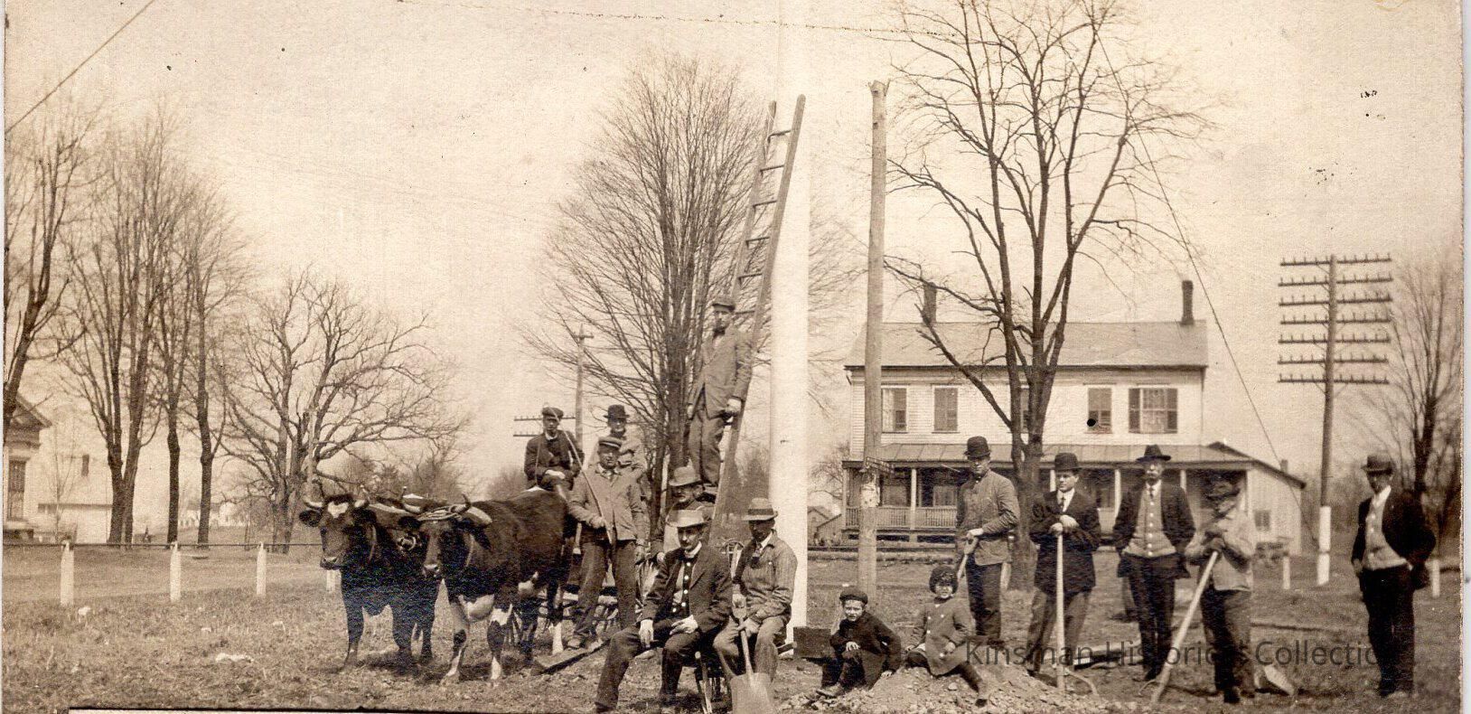 Group in front of Gee Home identified, but not clearly. W. Gee and [unknown] on wagon, D. McLean with whip, [unknown] on ladder, on stool H. J. Fobes, H. A. Sisley and W. Sawdy behind A. Emery and Esther Gee on rock pile, and Stacy Harshman, Rev. Gardner, E. R. Brackin, and J. P. Karr. Gee Home became Kinsman Clinic.Cataloged By