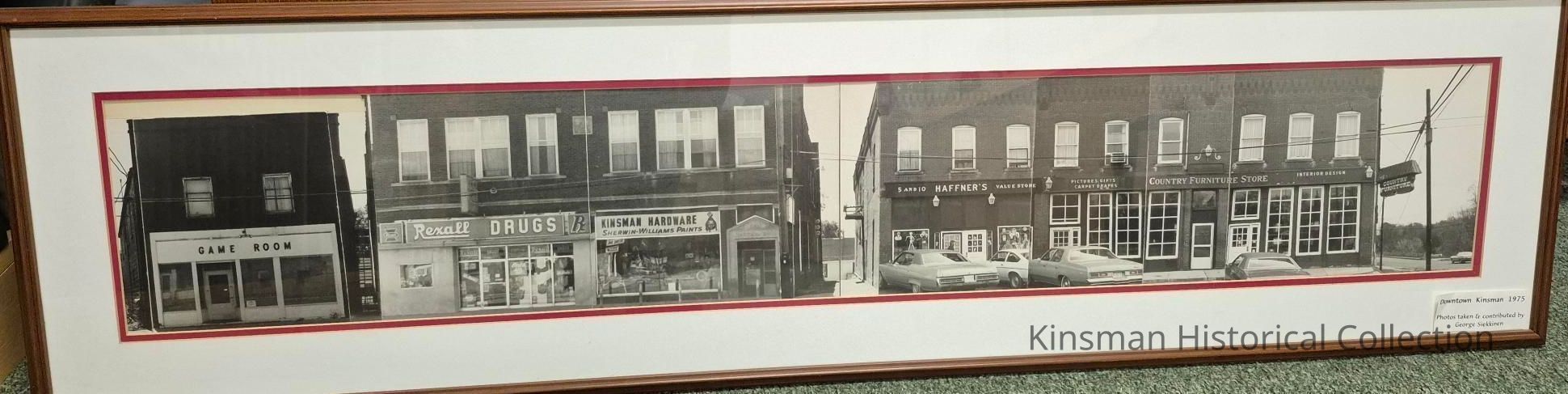 Panoramic photo of businesses located on Kinsman Square "Downtown Kinsman" including the Game Room, Rexall Drugstore, Kinsman Hardware, Haffner's 5 and 10 Value Store, and Country Furniture Store in 1975.Cataloged By