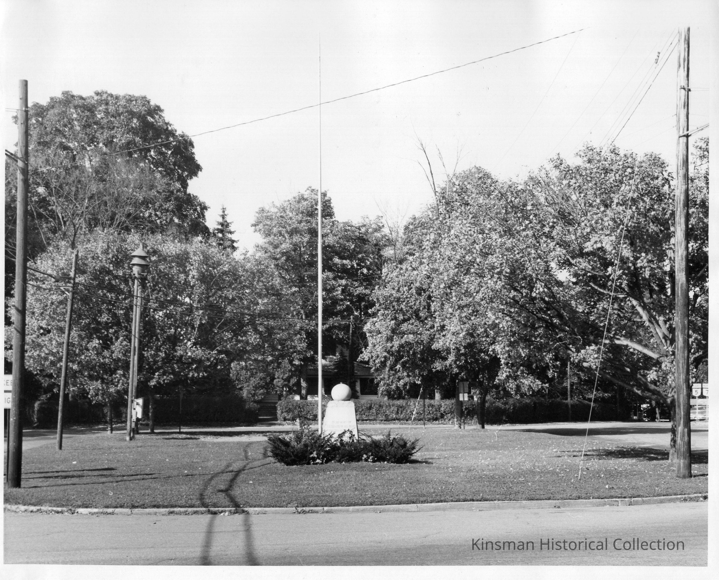 Kinsman Square without the bandstand but does include the Veteran's Memorial. Taken by Wilda Ball in October of 1974. (collapsed bandstand 2023.1.34).Cataloged By