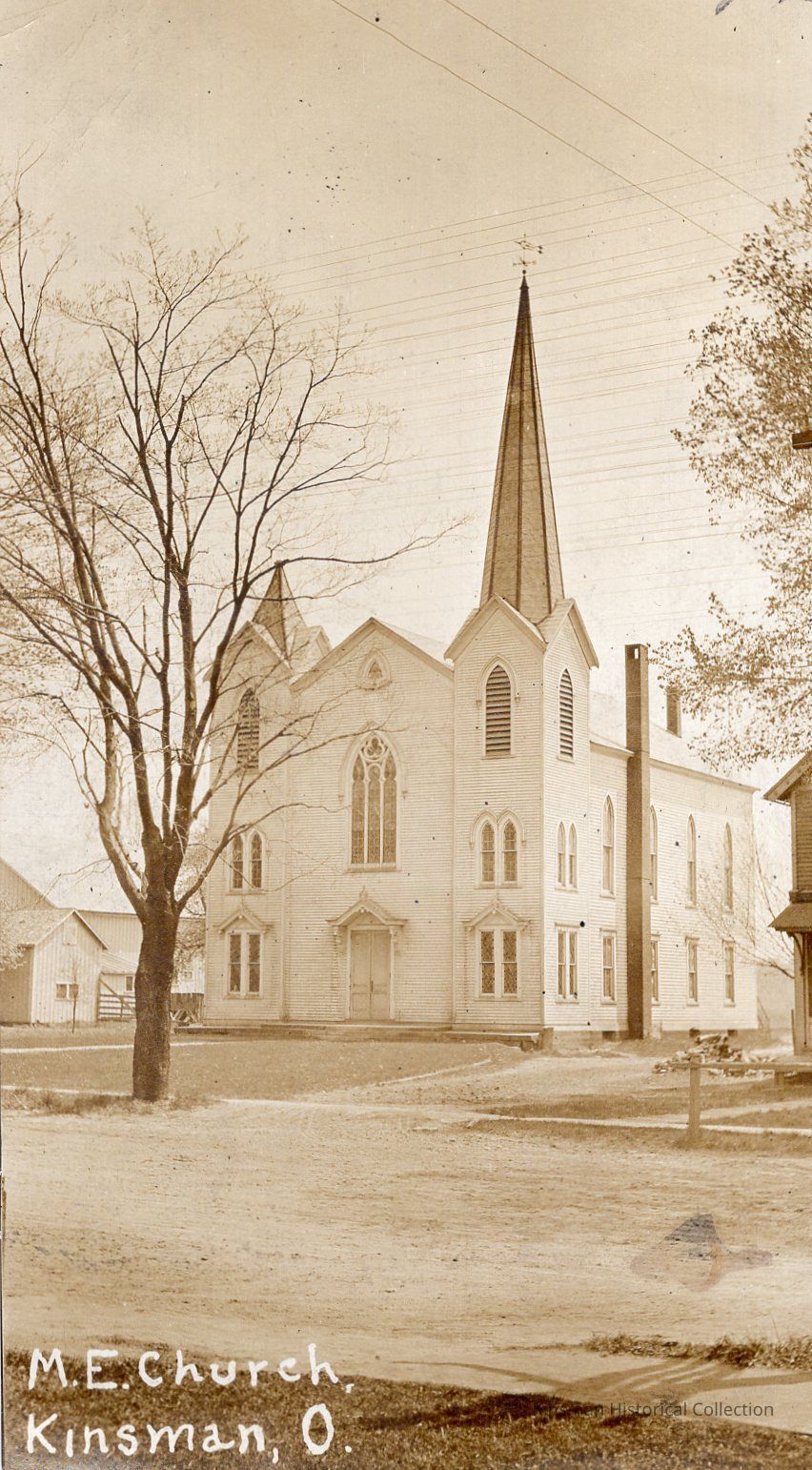 Exterior of the "M. E. Church", Methodist Church in Kinsman, Ohio taken from across the road.Cataloged By