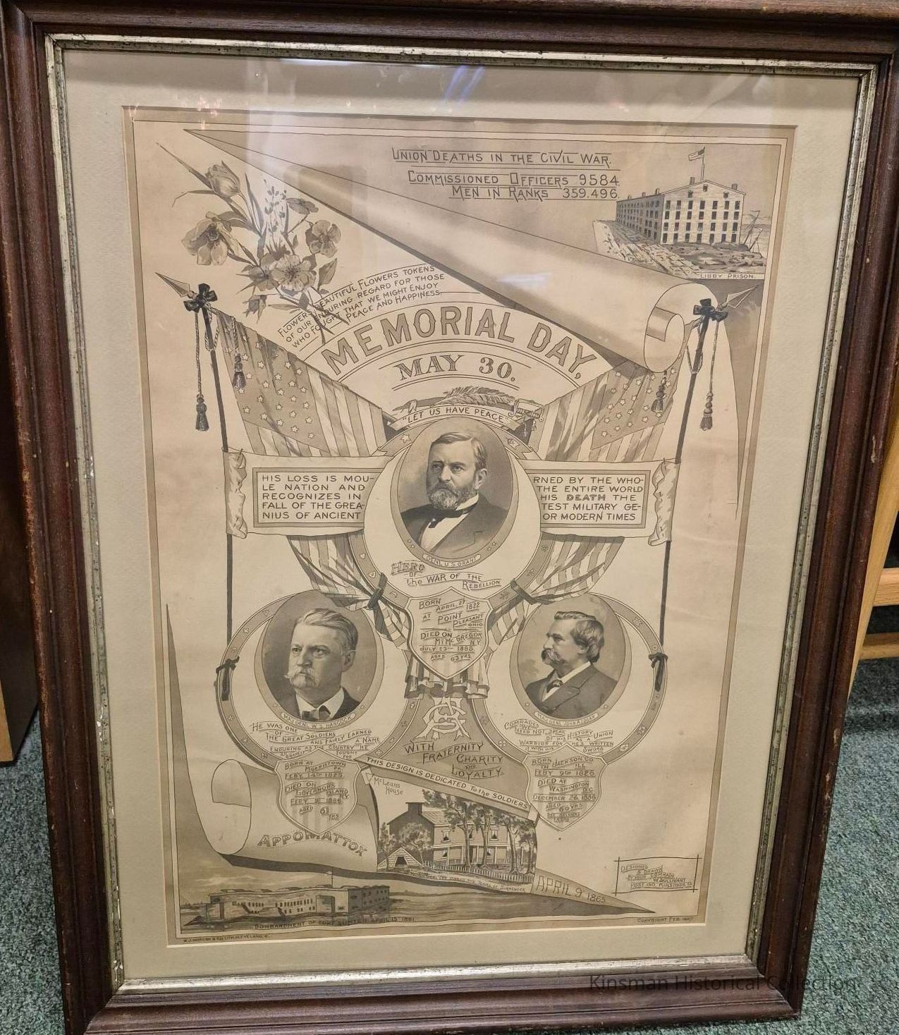 Memorial Day May 30 Remembrance poster featuring U.S. Grant, W.S. Hancock, and John A. Logan. With fraternity, charity, and loyalty this design is dedicated to the soldiers. Union deaths in the Civil War Commissioned Officers 9584 Men in Ranks 359.496. Designed and drawn by your comrade W. Sullivant Post 150, Kinsman, Ohio. Copyright February 1887.