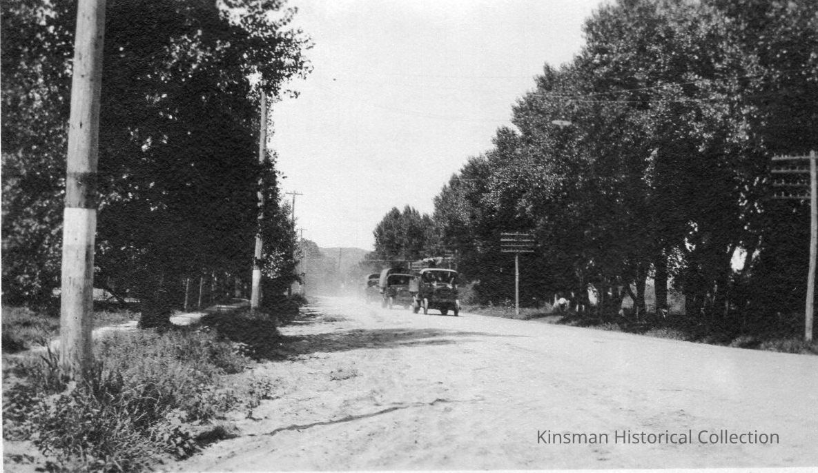 Convoy of covered Army transport vehicles driving down a dirt road. Writing on the back, "Taken in front of our house when the Army transport train came thru here". Presumably Root home similar to [2022.1.316].Cataloged By