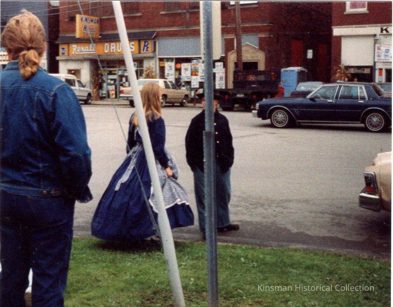 Couple in period outfits crossing the road in front of Market Square. Presumably part of the Civil War encampment recreation. Took place on October 2, 1993.Cataloged By