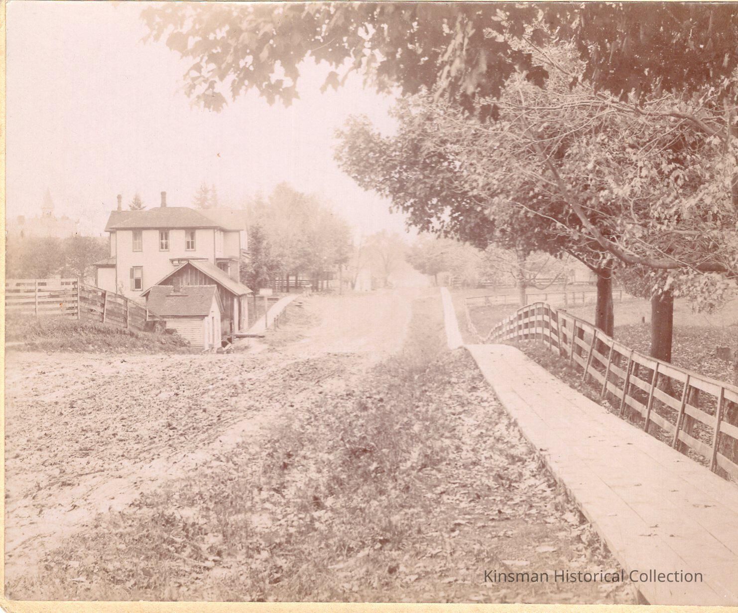 Wooden pathway and fence identified as looking north from the Square. Possibly the "Kinsman Gift School to left".Cataloged By