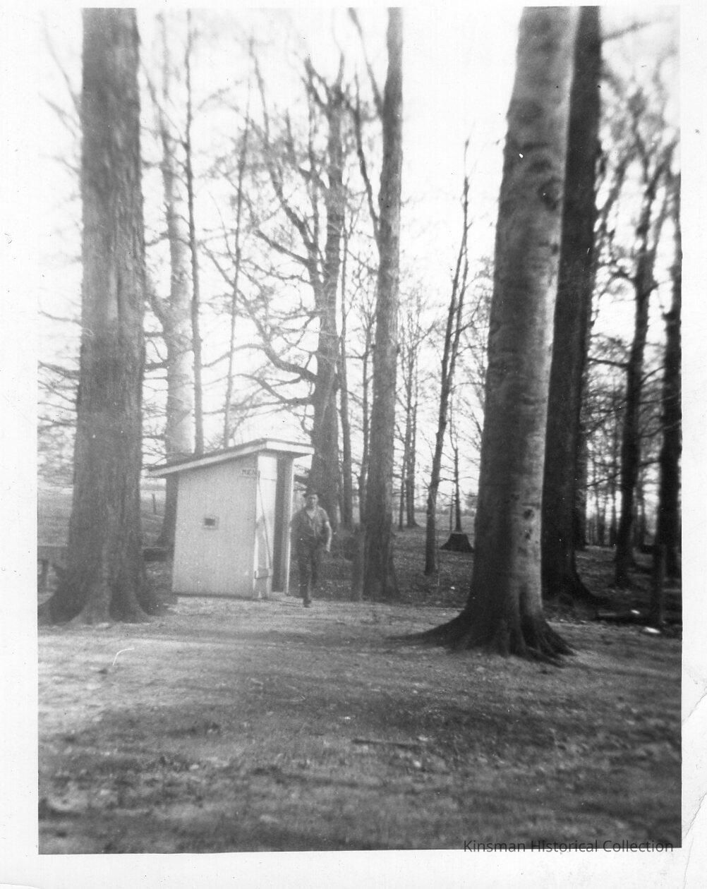 Man by outhouse. Writing on back "Hank at the Decons Beer Joint Williamsfield Ohio".Collection