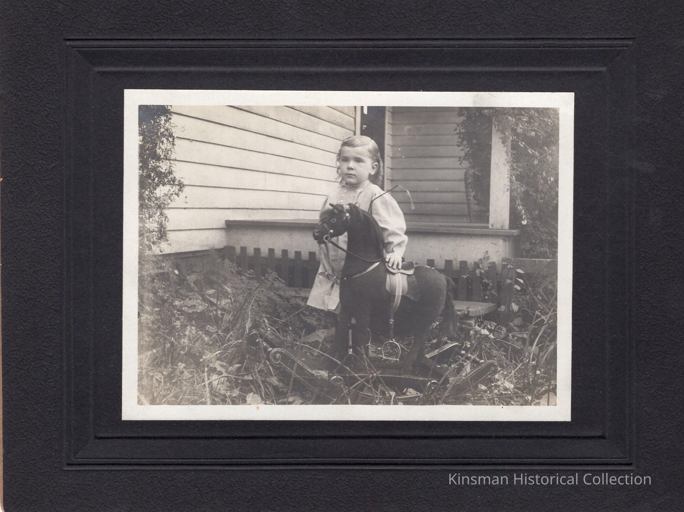Boy standing outside by a toy rocking horse. Possibly Phillip Lee Tracy at age 4 in 1908.Cataloged By