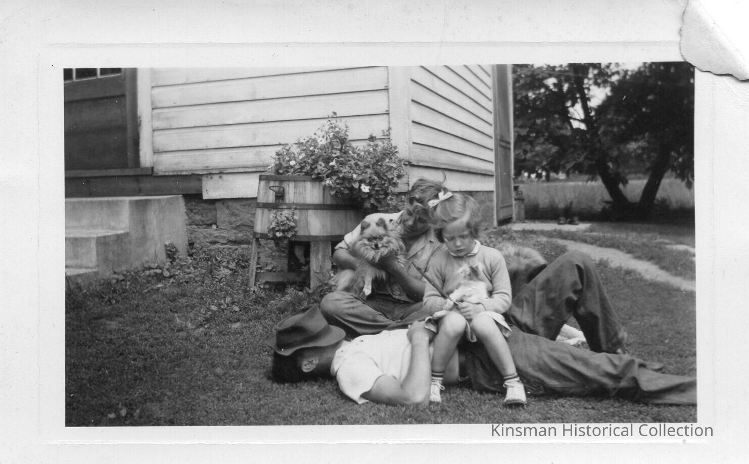 Family portrait on lawn with pets. Writing on back, "Francine Bacon 1942".Collection