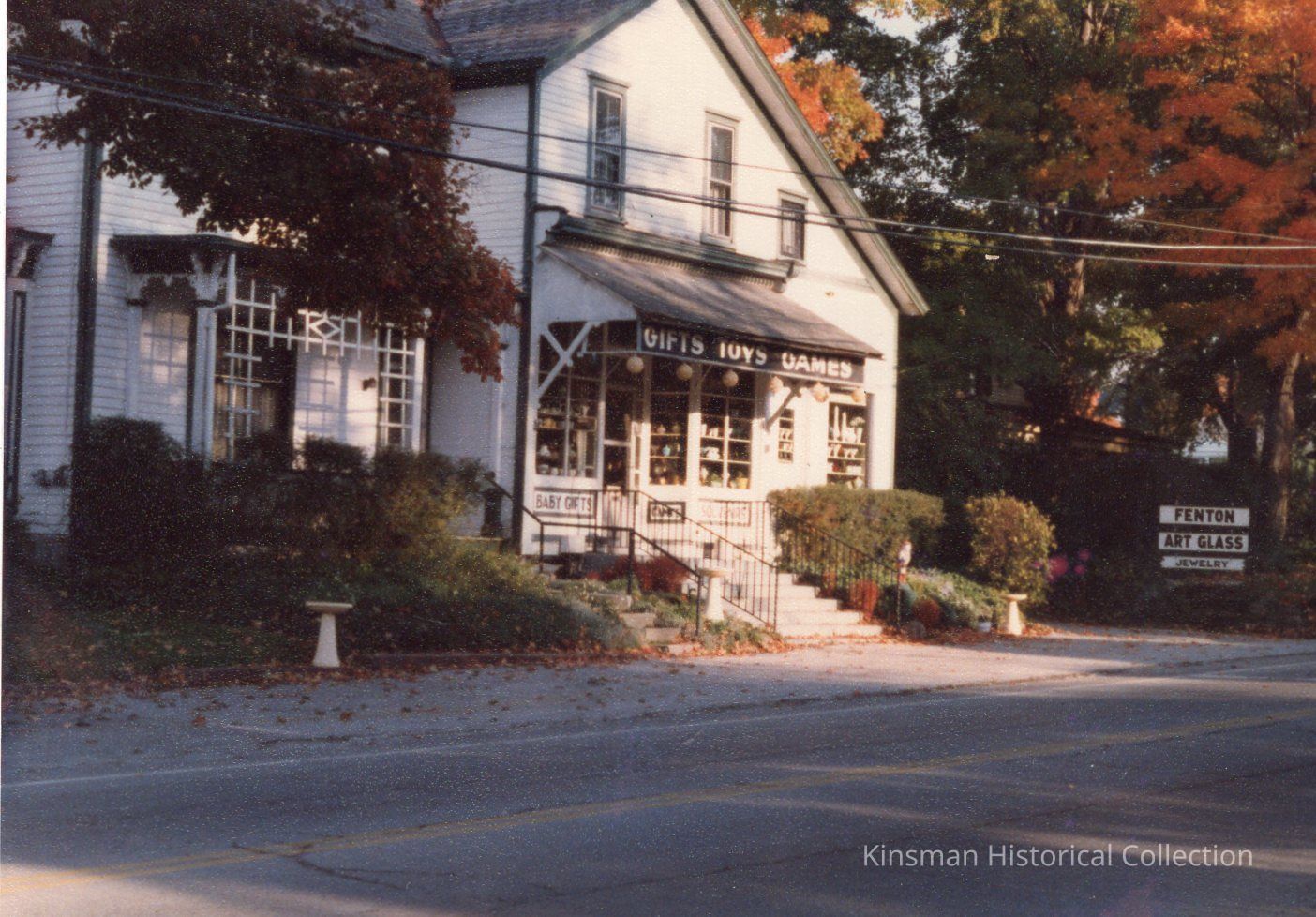 Exterior of the Kinsman Gift Shop from across the road. Advertising gifts, toys, games, Fenton art glass, and jewelry.Cataloged By