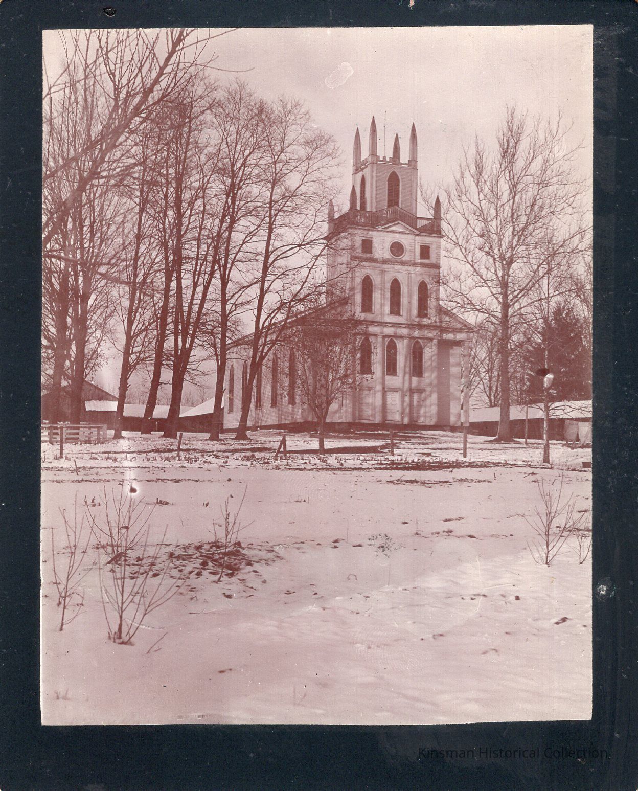 Kinsman Presbyterian "C & P Church" in winter with snow on the ground and bare trees. Note on the back points out the "horse-sheds in background".Collection