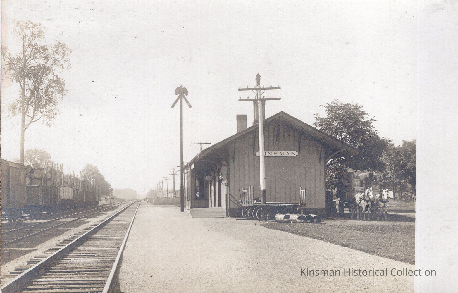 Kinsman Rail Station situated along the tracks. A pair of horses is parked along the building, its cart loaded with barrels. Writing on back to Miss Cortelle Bidwell, "This is the place you get off, when you come to Kinsman, O". Mailed in June 1911.Collection