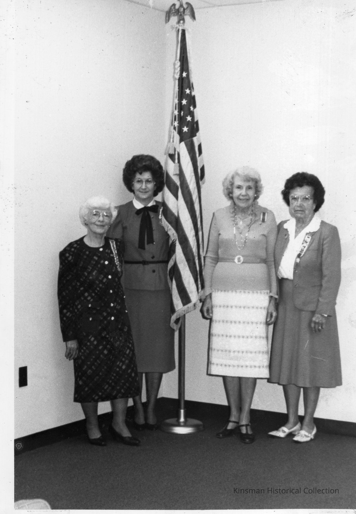 Members of the Mary Chesney Chapter of the National Society Daughters of the American Revolution (DAR) left to right: Sarah "Sally" May Thompson, Mrs. George Benson, Marjorie McElravy, and Mrs. Charles Plott presenting a new American flag to the Kinsman Free Public Library.Cataloged By