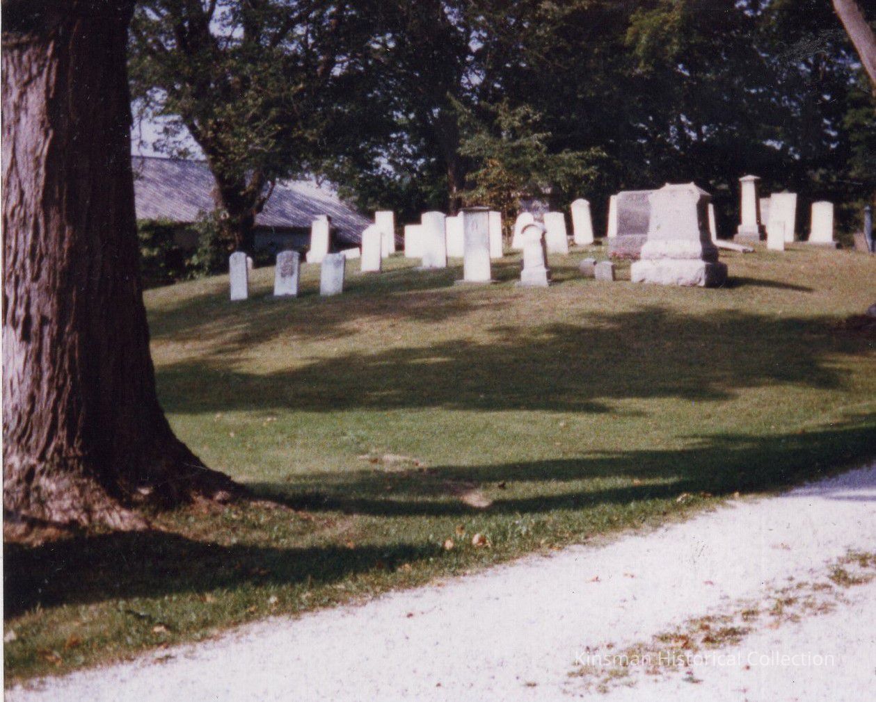 Tombstones by gravel driveway thought to be the Kinsman Cemetery.Collection