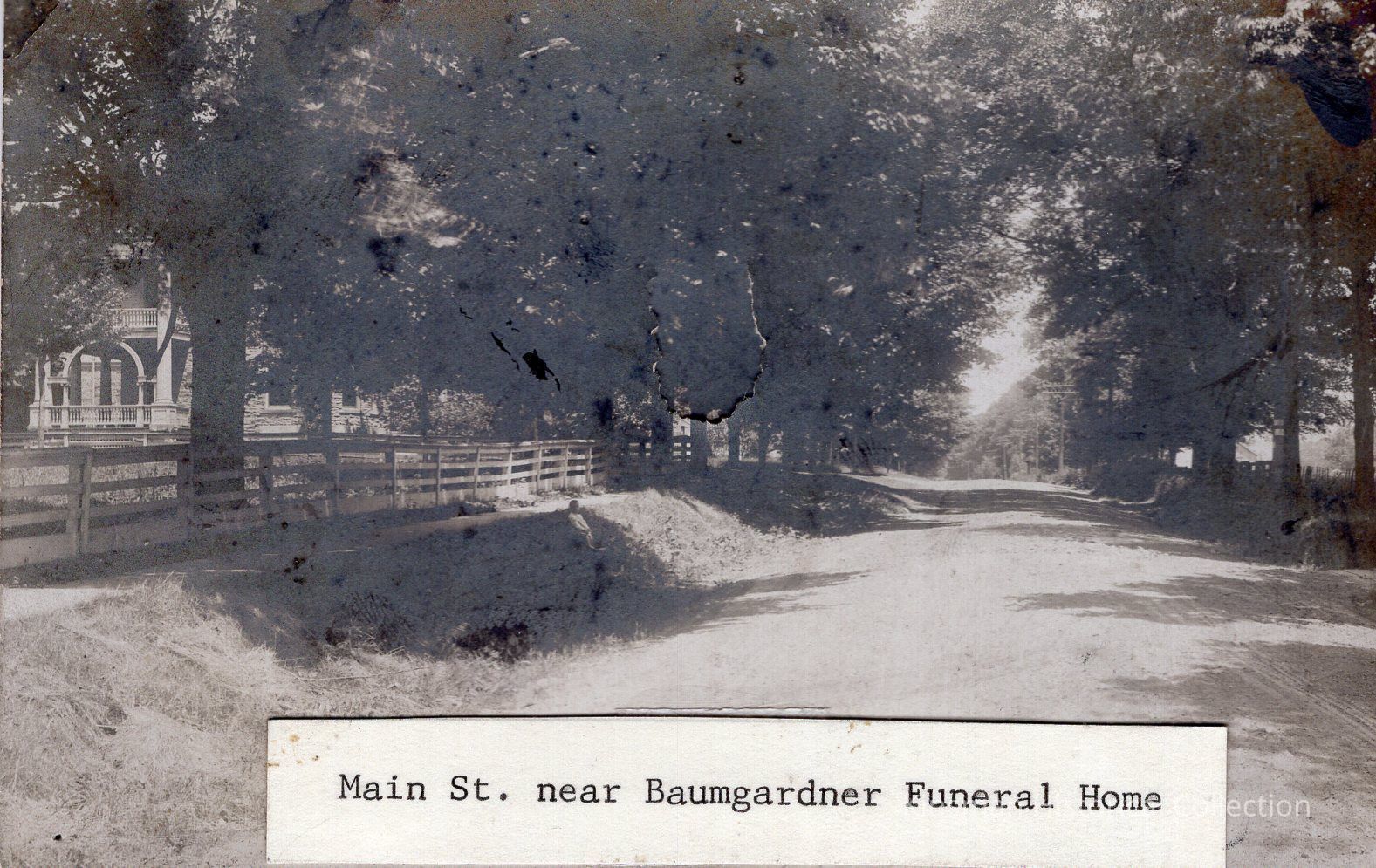 Tree lined roadway identified as "Main St. near Baumgardner Funeral Home".Cataloged By