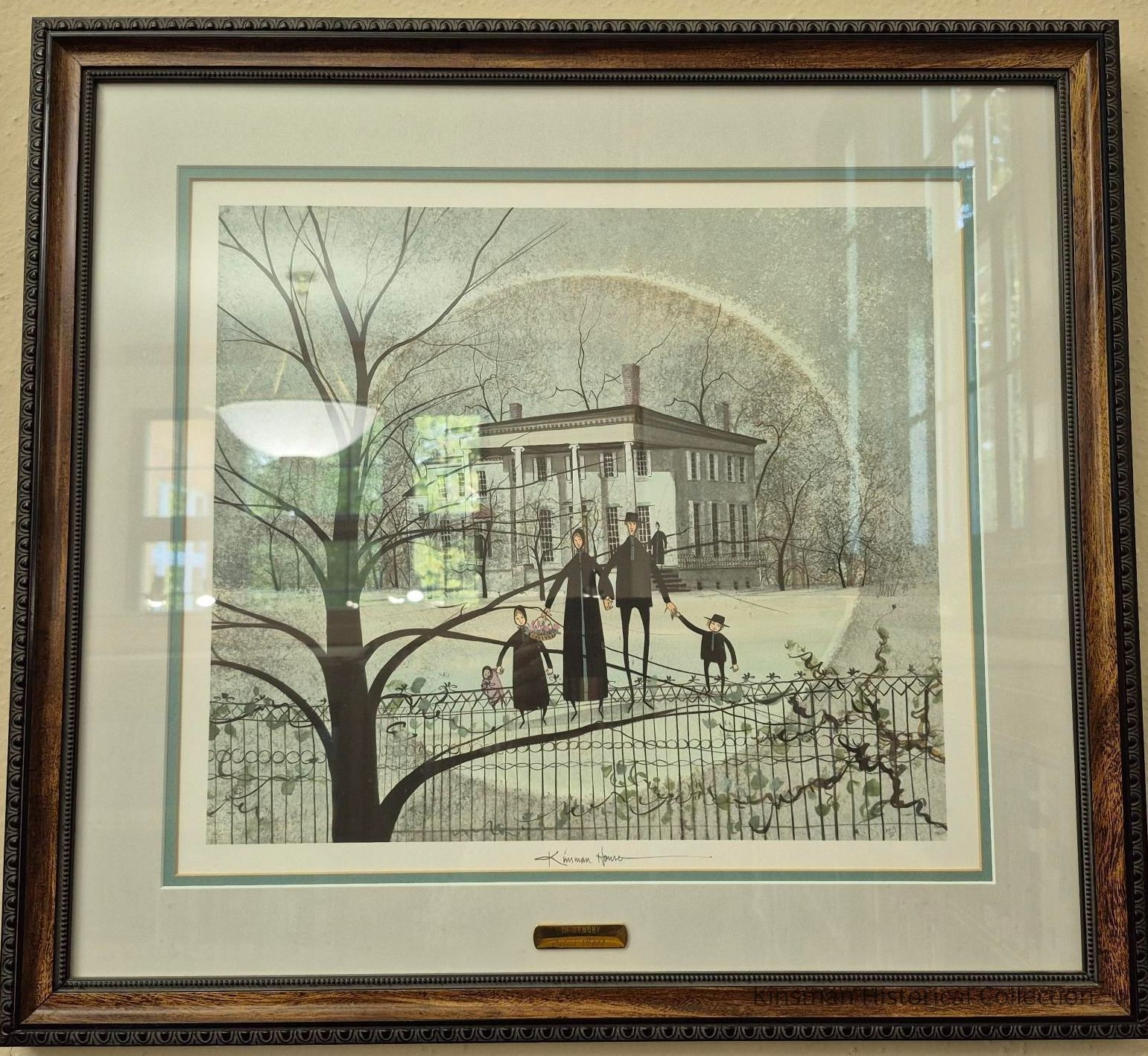 Kinsman House painted by P. Buckley Moss in 1990. Winter scene featuring family in memory of Julius Root.Cataloged By