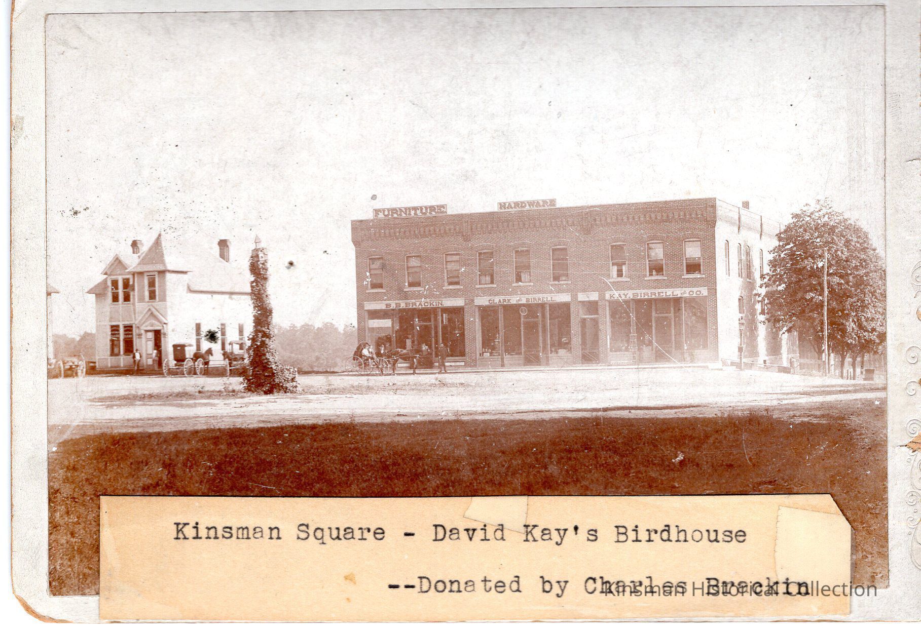 South side of Kinsman Square including David Kay's birdhouse, the Kinsman National Bank, and businesses B. B. Brackin, Clark and Birrell, and Kay, Birrell and Co.Collection