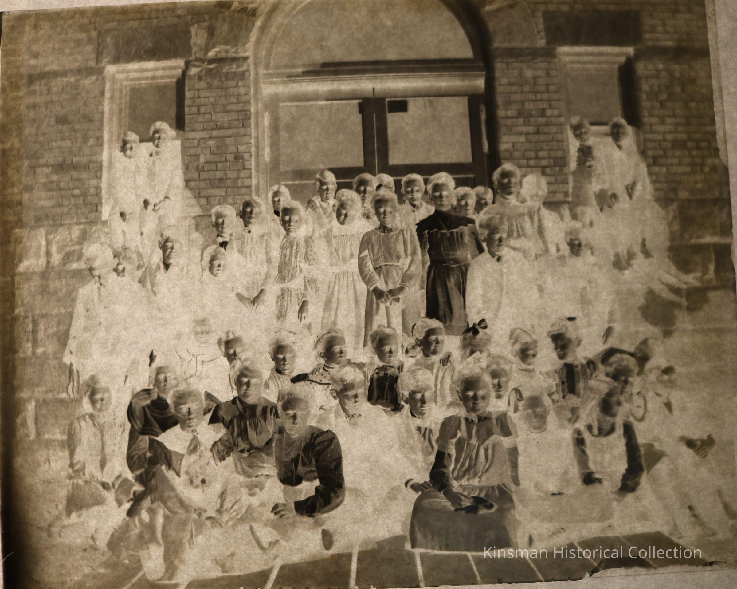 Group of people in front of brick building thought to be a class photo.Collection