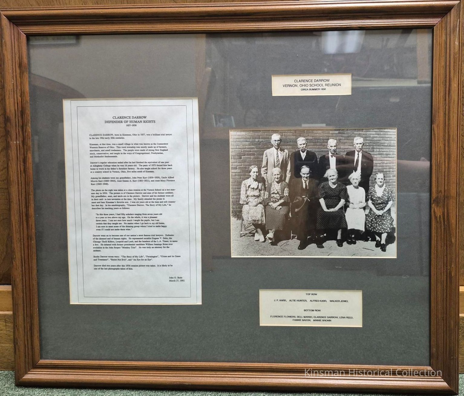 Framed collage of Clarence Darrow's Vernon, Ohio School Reunion circ Summer 1936, list of attendees and brief biography.