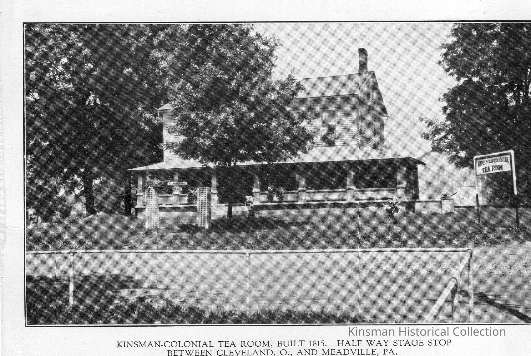 Postcard advertising the "Colonial Tea Room, Built 1815. Half way stage stop between Cleveland, O., and Meadville, PA.". On the back description "Menus for special parties by arrangements. Winter parties accommodated. Chicken dinner and lunches served. Phone 102 Kinsman, Ohio. Rest rooms. Reservations by phone appreciated."Cataloged By