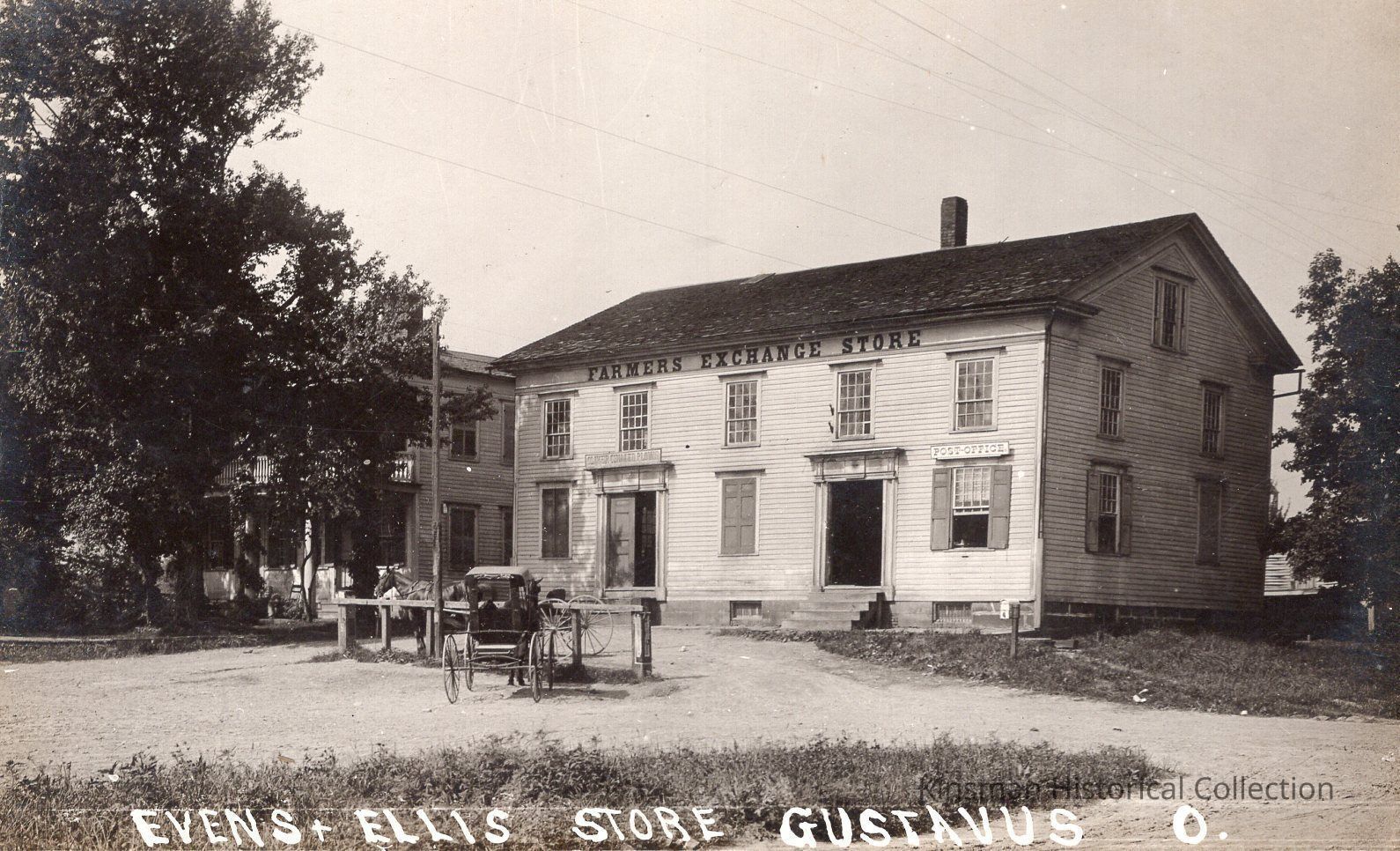 Front facade of Evens and Ellis Store in Gustavus, Ohio with horse and carriage parking in the front. Building also advertising Post Office and [unreadable] Plows.Cataloged By