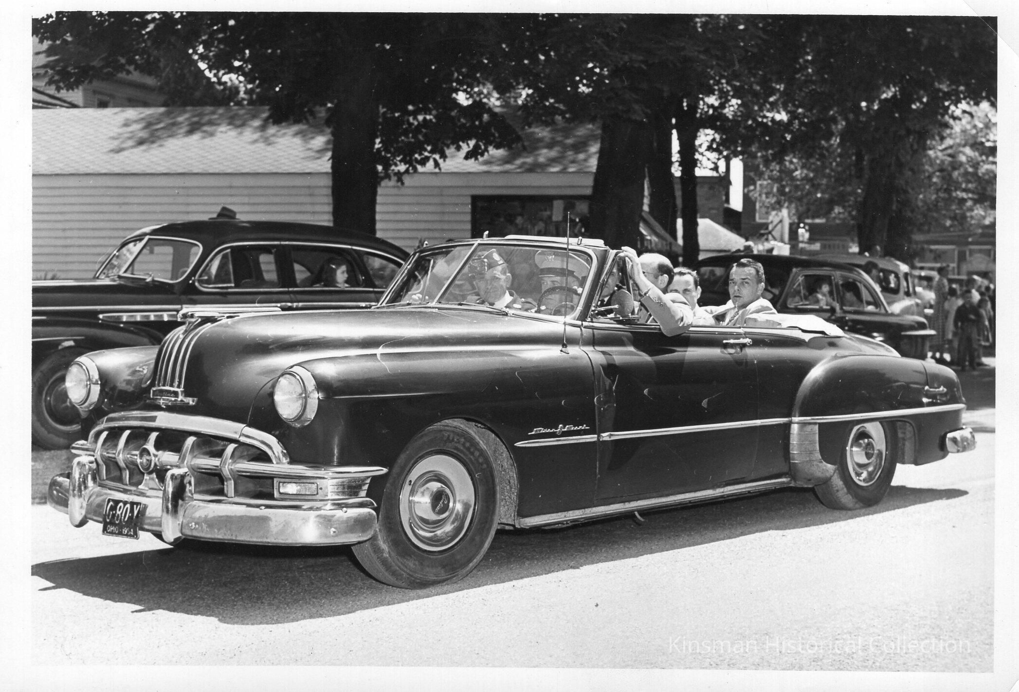 Kinsman's Memorial Day parade in 1954 featuring a late model Buick Silver Streak convertible driven by Harry Marsh, Vick Logan in the middle, and Frank Bolden in the front seat with Memorial Day keynote speaker Congressional Representative Oliver Payne Bolton in the back seat with an aide. The car is leaving the square heading north up Main Street.Cataloged By
