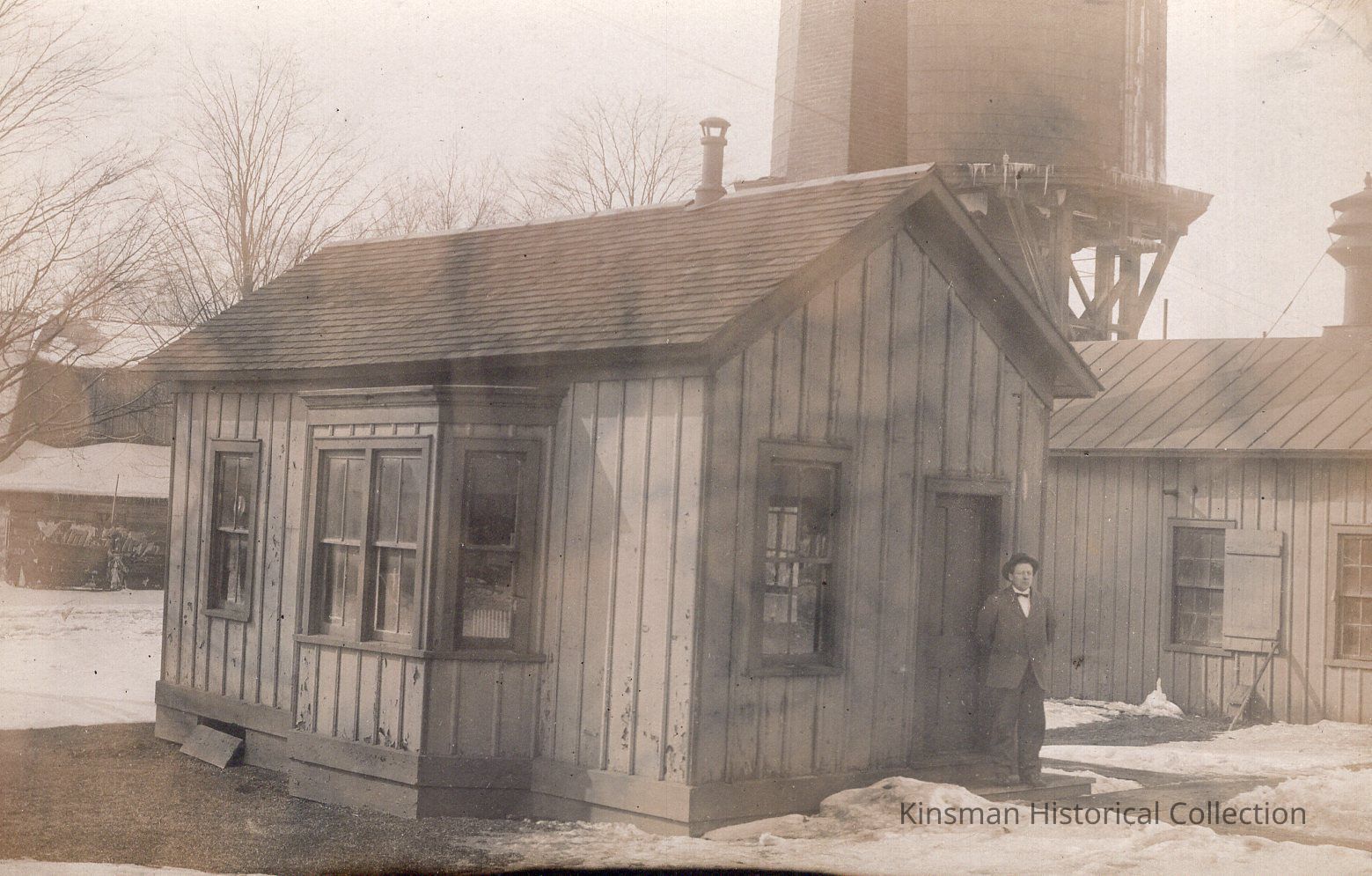 Man standing in front of "Andover, Ohio Rail Station". Large water tower in the background.Collection