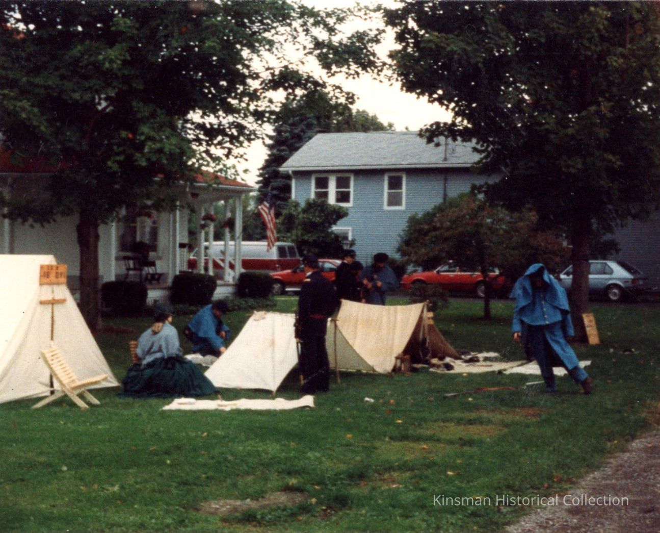 Group of people in period outfits with tents showing a recreation of a Civil War encampment. Took place by the Octagon House on Main St. in Kinsman on October 2, 1993.Cataloged By