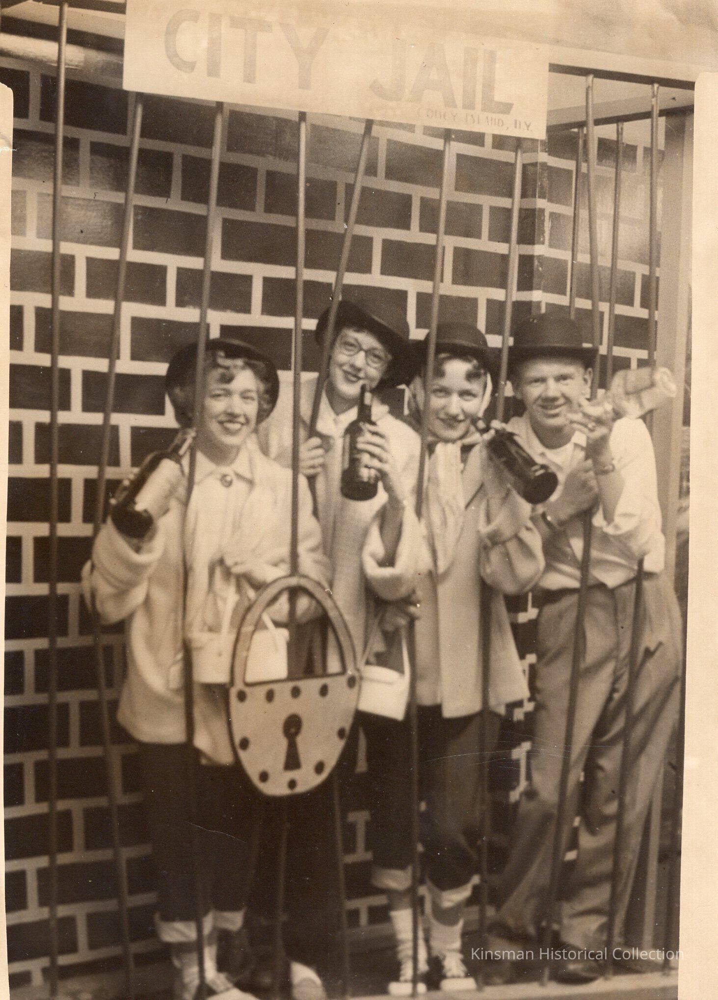 Group in a city jail photo booth with bottles at Coney Island, New York identified L to R Shirley Barr McElroth, Yvonne Kellar Thorn, Joan Panak Sawayda, and Frank Carmichael.Cataloged By