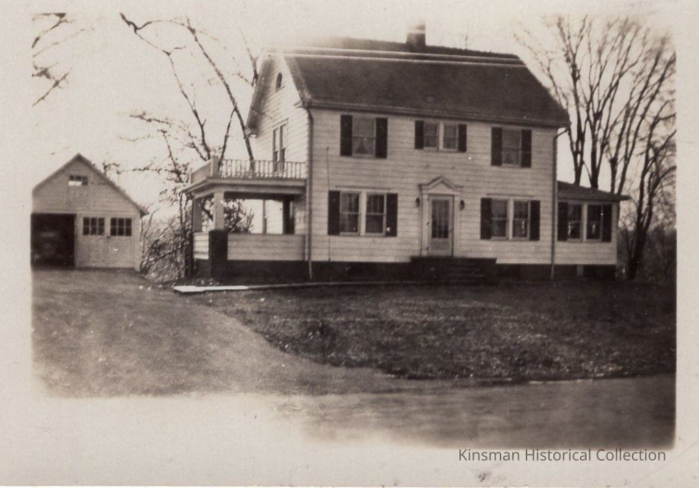 White two-story house with a side porch identified as Florence and Dell Evans house in Kinsman "when it was just new".Cataloged By