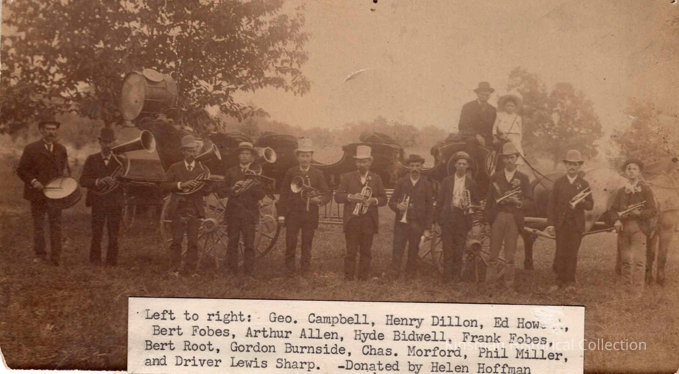 Band outside by horse drawn wagon. Members identified from left to right as Geo. Campbell, Henry Dillon, Ed Howell, Bert Fobes, Arthur Allen, Hyde Bidwell, Frank Fobes, Bert Root, Gordon Burnside, Chas. Morford, Phil Miller, and driver Lewis Sharp.