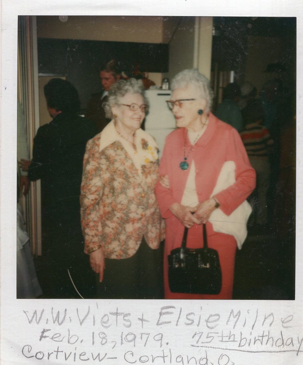 Elsie Milne (right) and W.W. Viets (left) at a 75th Birthday celebration on Feb 18th, 1979 at Cortview-Cortland, Ohio.Collection