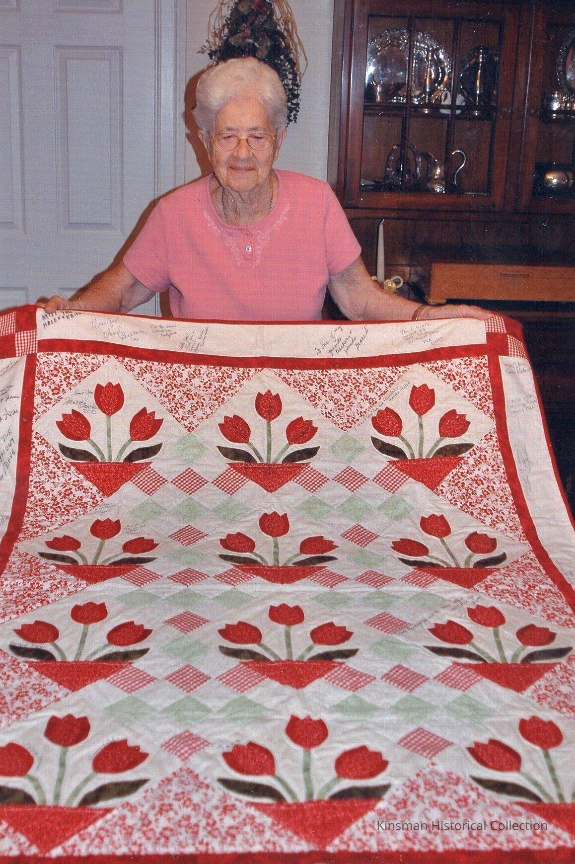 Janet Wasik admiring a quilt made by church members and neighbors to show appreciation for her contributions to the Kinsman community. Long-time Kinsman resident, she was a teacher, active in the Kinsman Presbyterian Church, and served on Kinsman Public Library Board. The quilt was signed and sent to her in Maryland after she left Kinsman abruptly to be close to family.Cataloged By