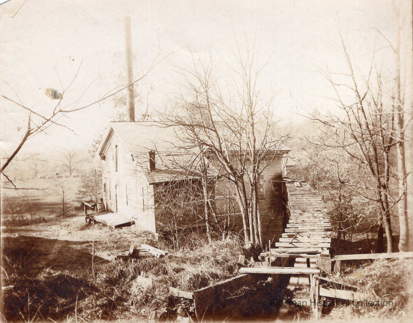 Hamilton's Mill with slatted wooden chute. The first electricity was produced here.Cataloged By