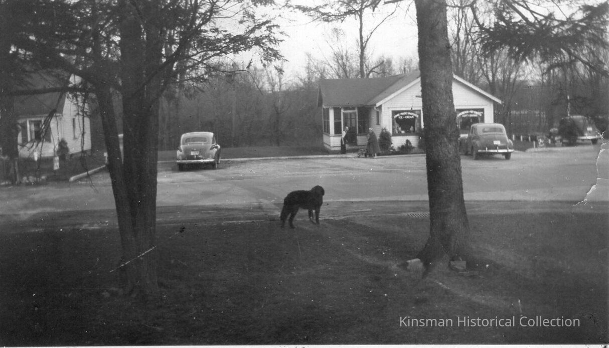 Exterior of Times Square Restaurant from across the street "from the west side of Rt 5 & 7" which was then the front yard of Mattie Way's home. The home was moved west which opened the corner for a gas station then Nelson's Diagnostic Car Care Inc. Alice Blaemire took over running the restaurant in 1946. The window reads "Home Made Pastries, Ice-Cream". Also included are parked cars, a dog, and two people entering.Cataloged By