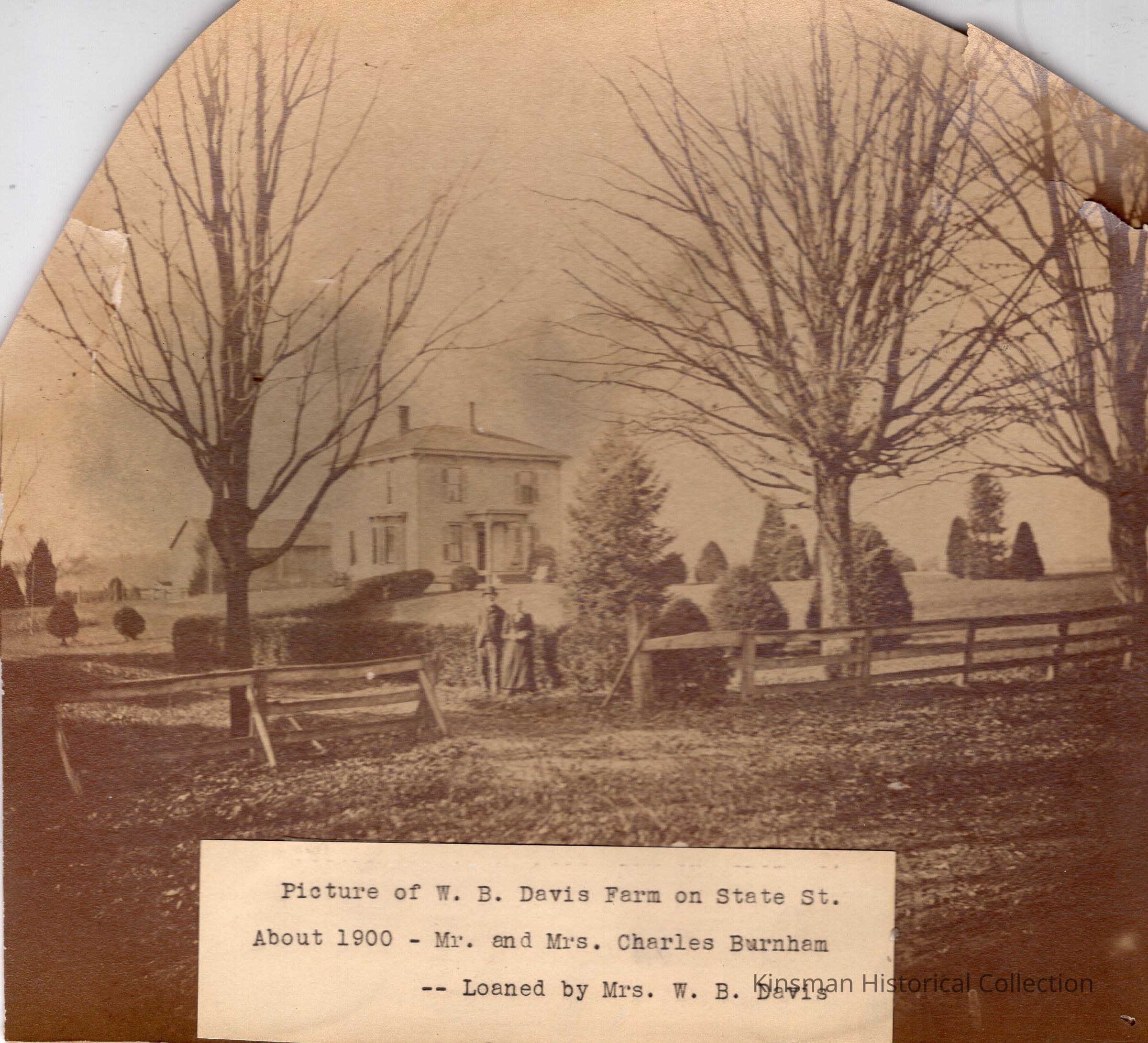 W. B. Davis Farm on State Street about 1900 with Mr. and Mrs. Charles Burnham standing in front. Presently 8685 State Street in Kinsman.Cataloged By