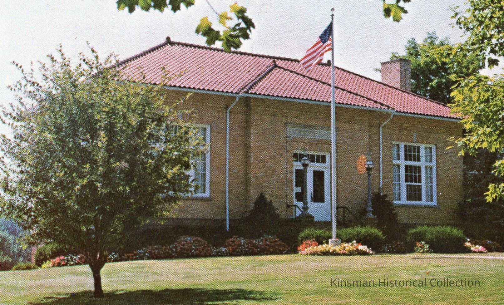 Front façade of Kinsman Free Public Library on a postcard as a memorial tribute to L. E. Garlock, 1976. The description states "Kinsman Free Public Library located at 6420 Church Street kinsman, Ohio 44428. Carnegie Building- Built in 1912-1913. 25,000 volumes. Books and Services are free to all residents of Trumbull County. Interlibrary loan and reference services available. 'Friends of the Library' organized 1974".Collection