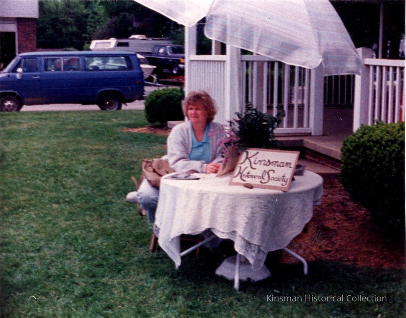 Gerry Stafford seated at a table by the Kinsman Square gazebo supporting Kinsman Historical Society. Presumably for Kinsman Old Fashion Days on May 20, 1991.Cataloged By