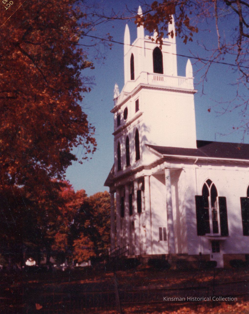 Exterior of Kinsman Presbyterian Church surrounded by fall foliage, dated October 1983.Collection