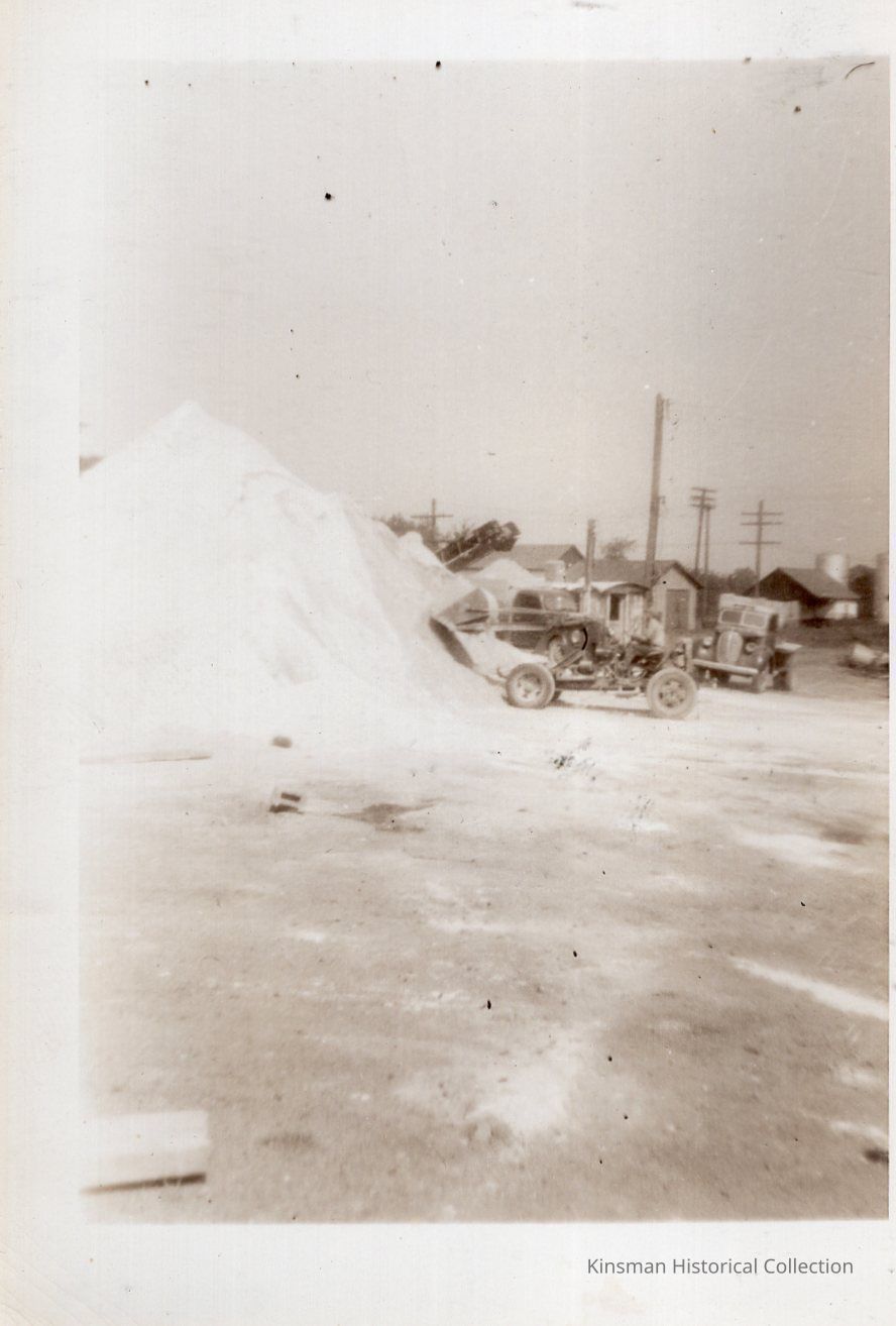 Mound of salt or sand with small building in the background and two vehicles.Cataloged By