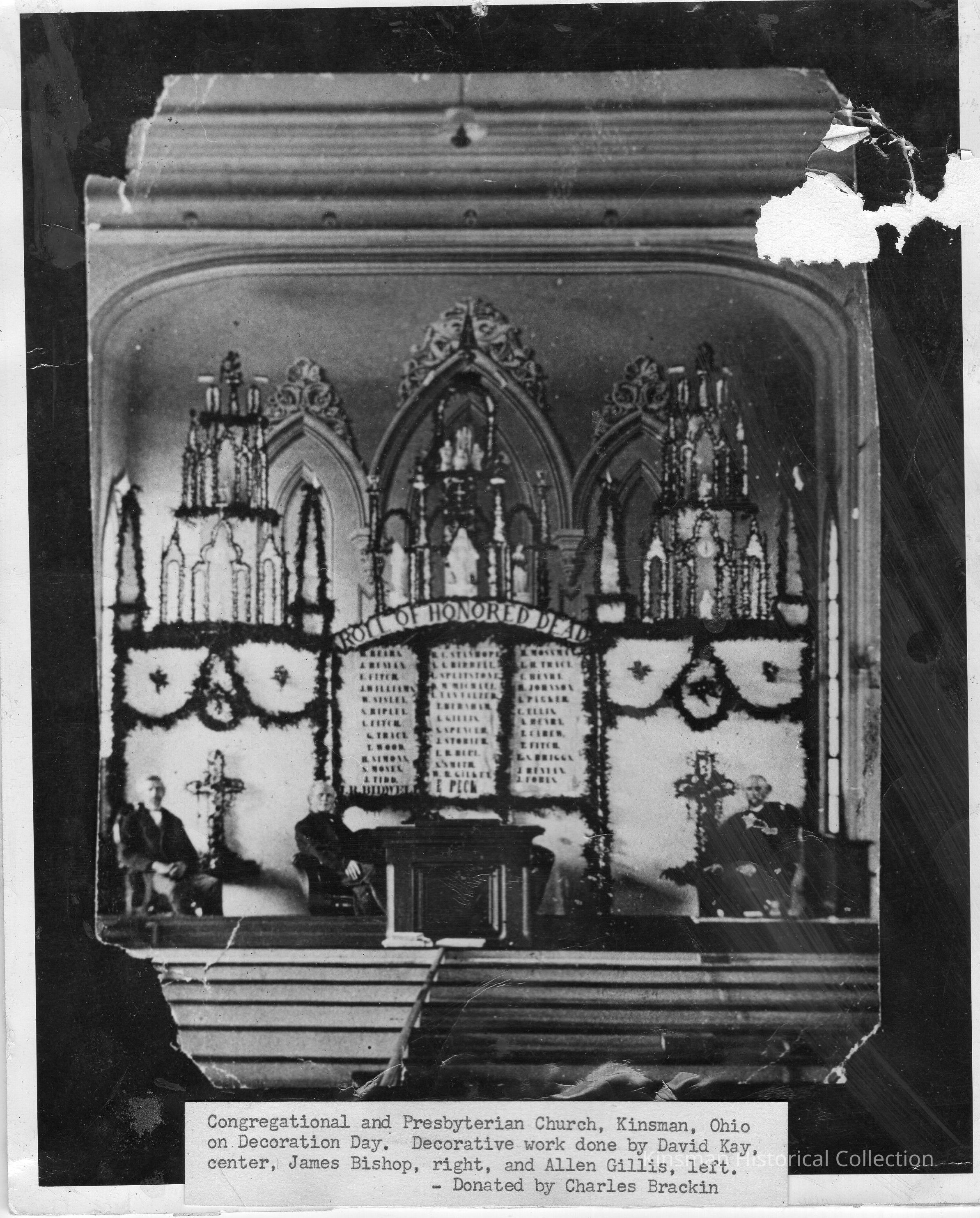 Interior of "Congregational and Presbyterian Church, Kinsman, Ohio on Decoration Day. Decorative work done by David Kay, center, James Bishop, right, and Allen Gillis, left." The decorations include a "Roll of Honored Dead" in the center listing names that are hard to read but might include; Tidd, Bidwell, Storier, Peck, Fitch, Briggs, Fobes.Collection