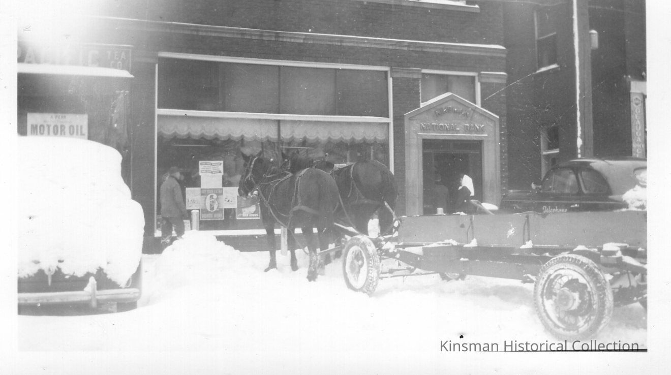 The Kinsman National Bank with horse drawn wagon parked in front in a lot covered in a heavy snow, dated on back as December 12, 1944.Collection