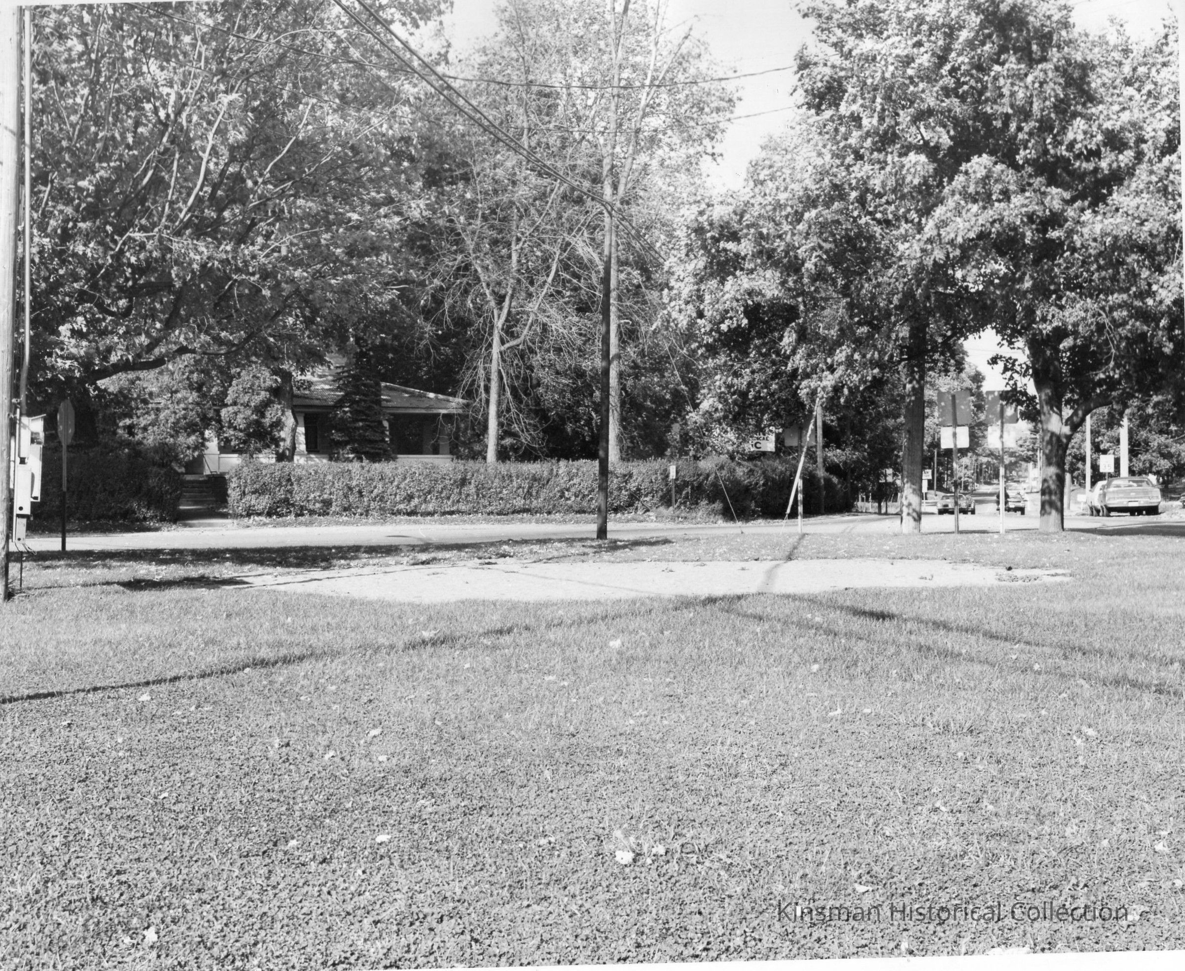 Empty area where the bandstand once stood in Kinsman Square. Taken by Wilda Ball in October of 1974. (collapsed bandstand 2023.1.34).Cataloged By
