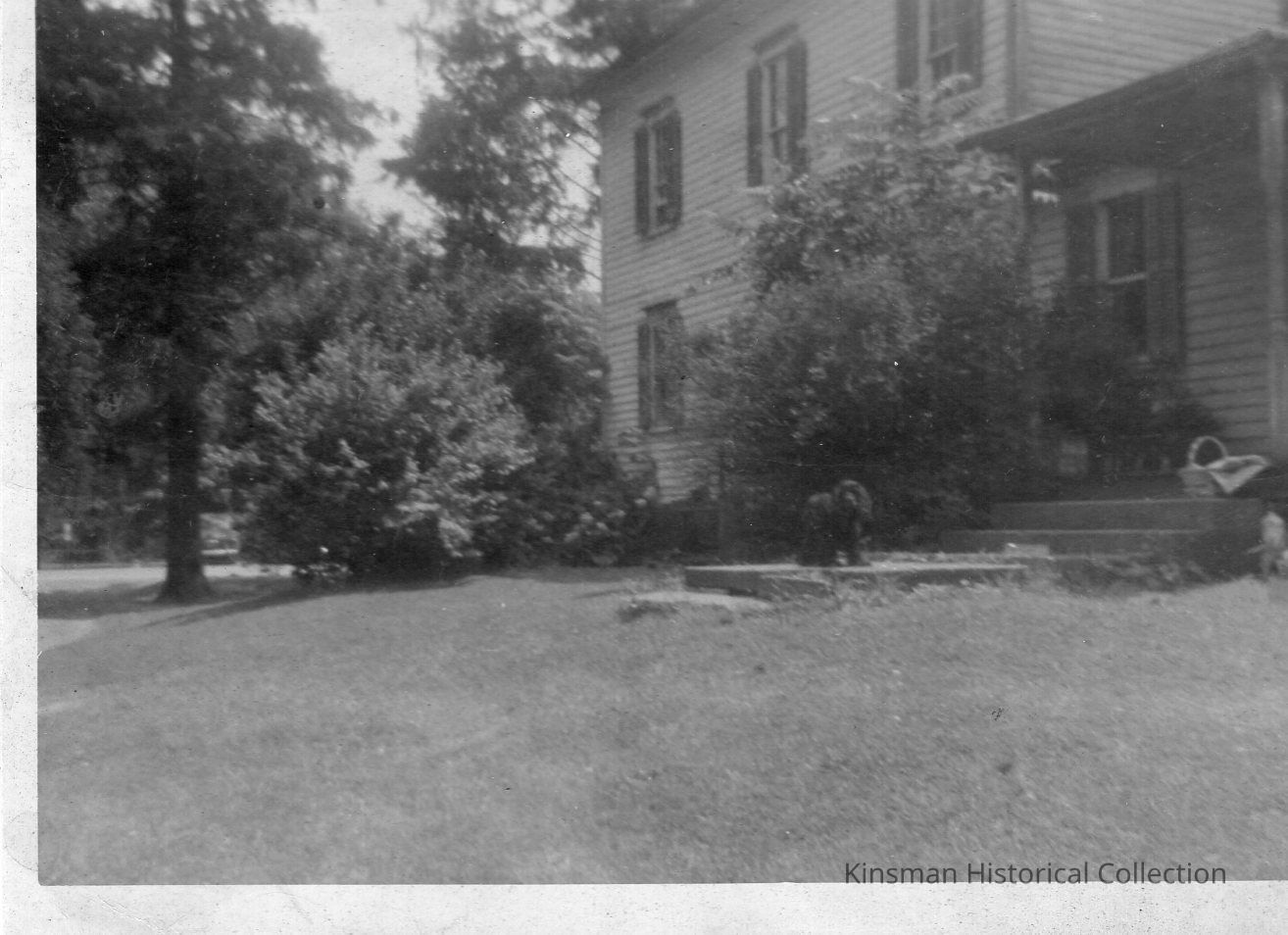 Two story house with black shutters featuring dog standing on step taken in August 1956.Cataloged By