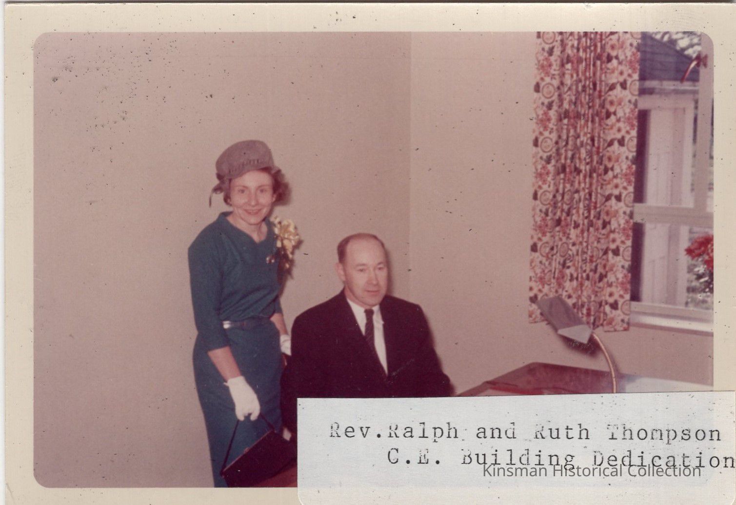 "Rev. Ralph and Ruth Thompson at the C.E. Building Dedication". Identified on back as probably late 1950s in the new education building.Cataloged By