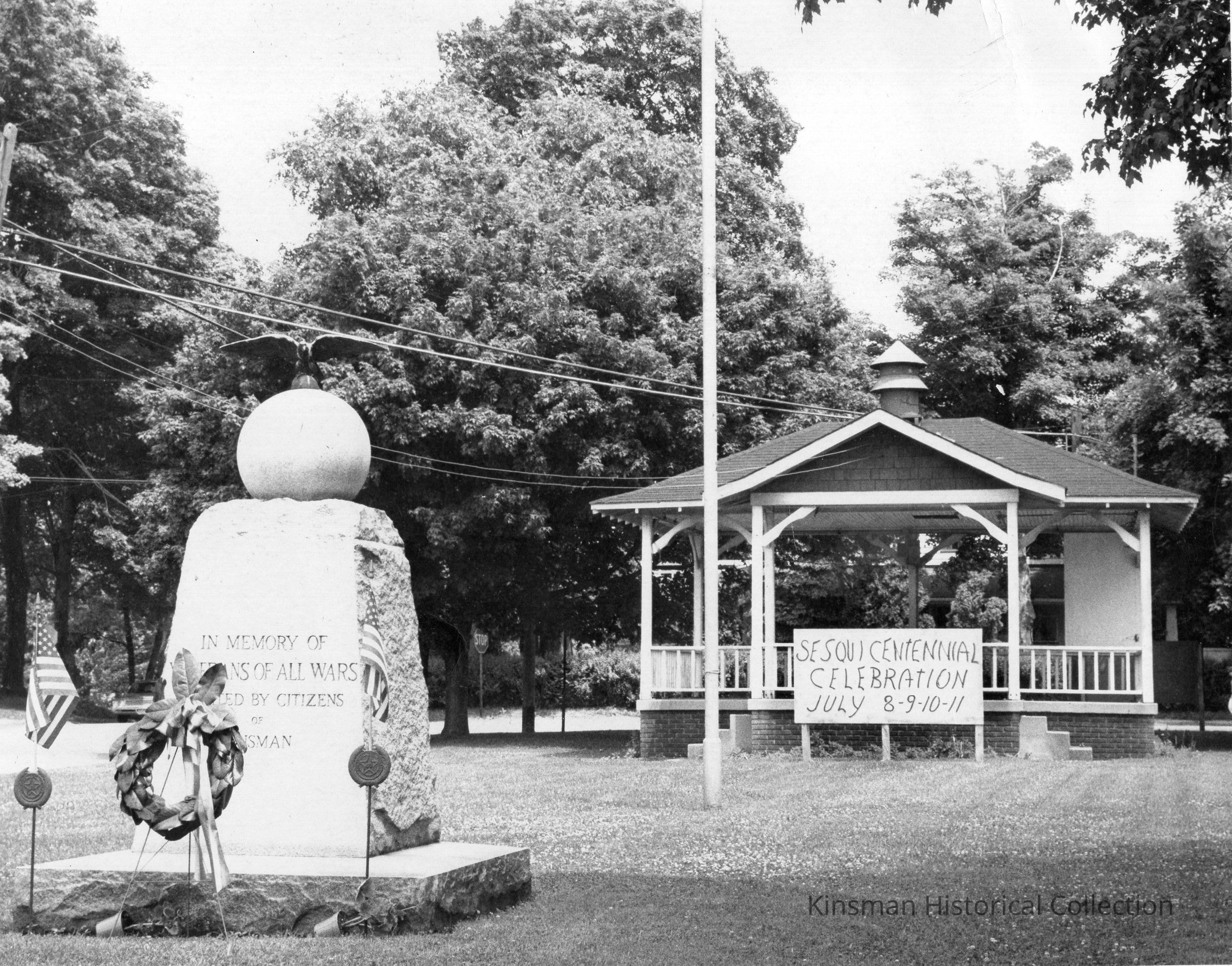 The Kinsman bandstand in the center of the square with a sign advertising "Sesquicentennial Celebration July 8-9-10-11" which was celebrated in 1970. The Veterans Memorial in the foreground dedicated "In Memory of Veterans of All Wars by Citizens of Kinsman". Photo acquired from the Warren Tribune.Collection